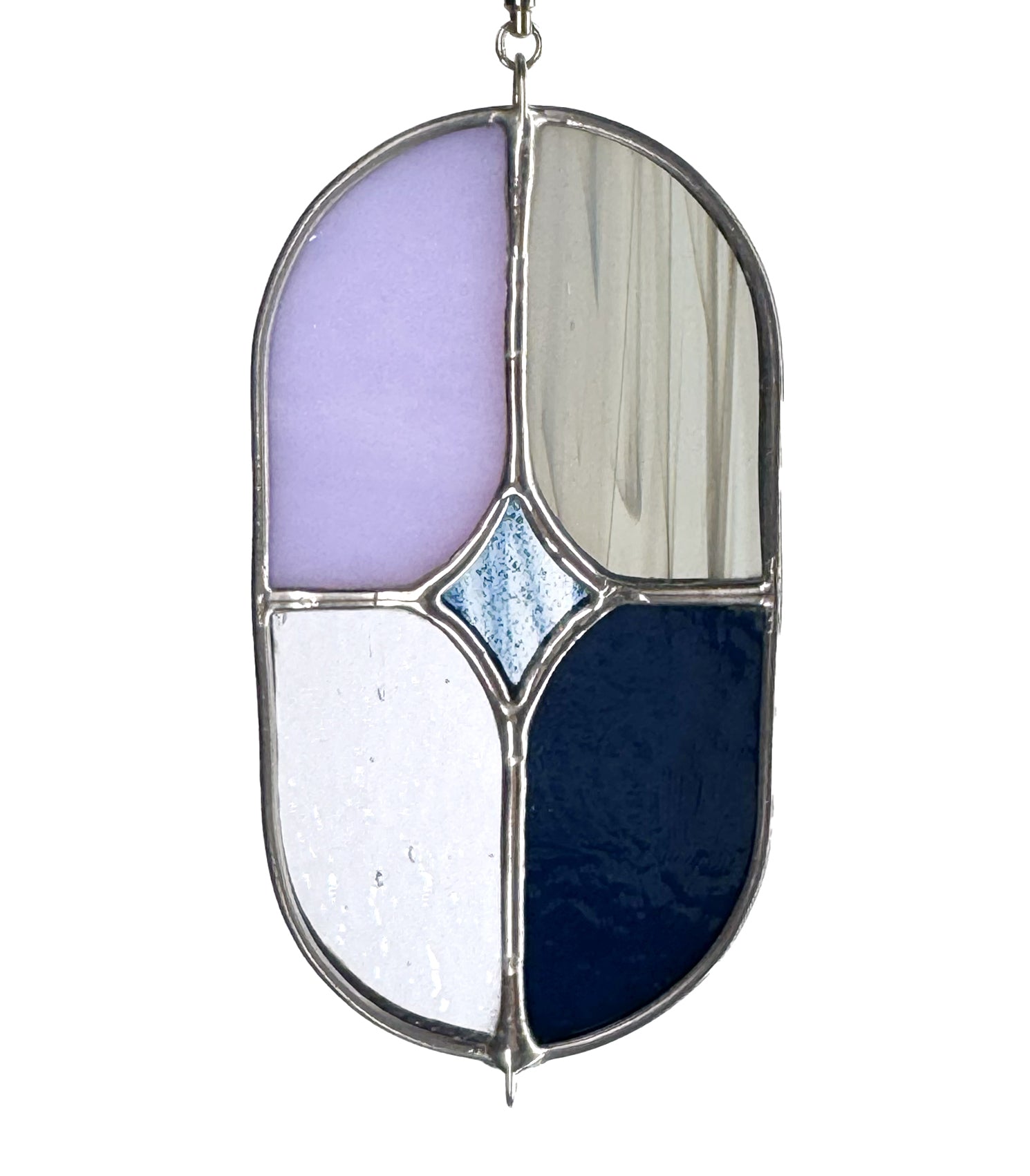 Handmade stained glass suncatcher pendant depicting the aidu glass logo. Central diamond star is transparent wispy blue aventurine glitter, surrounded by muted shades of purple, gray, and navy. You receive the exact piece pictured!