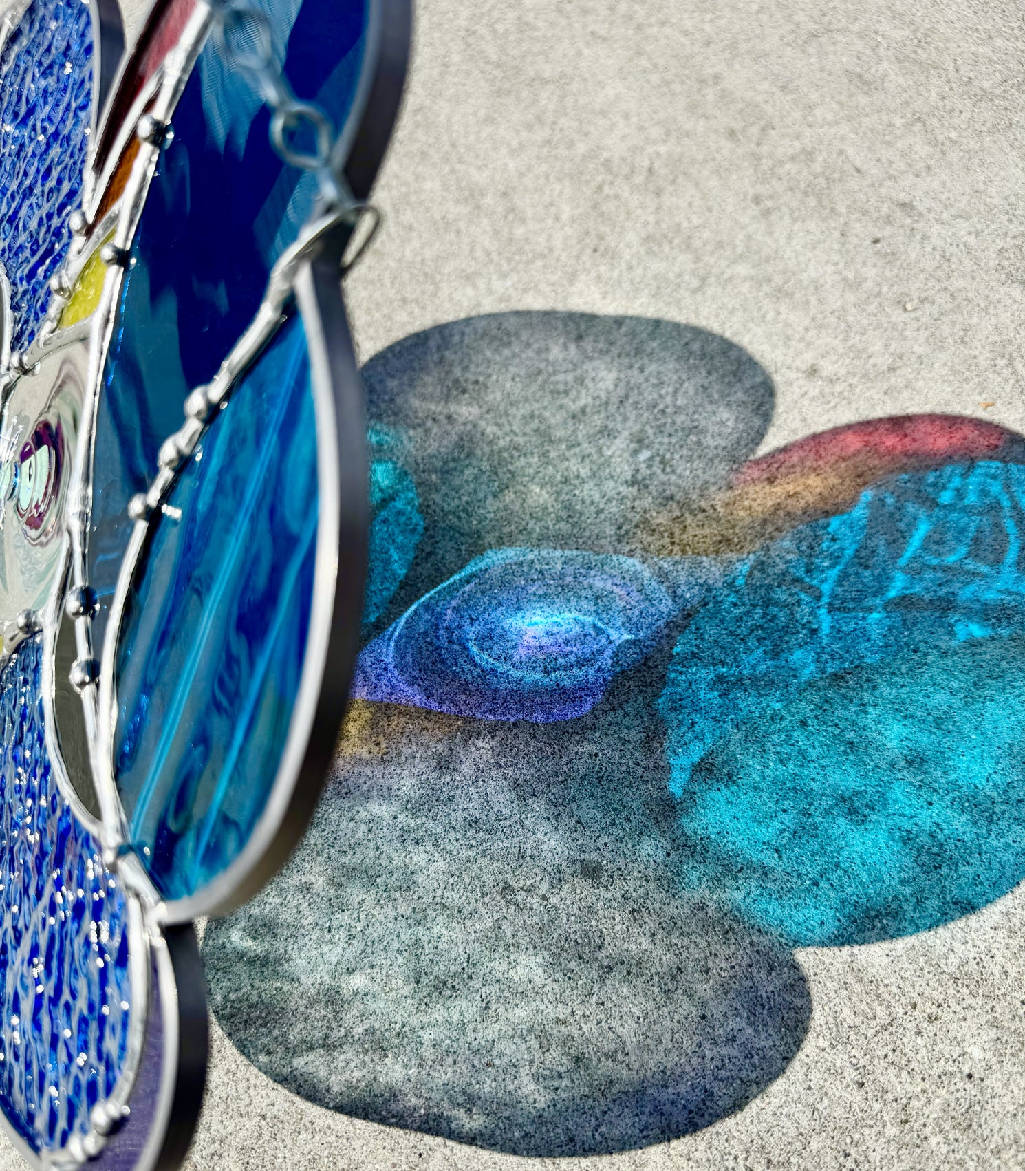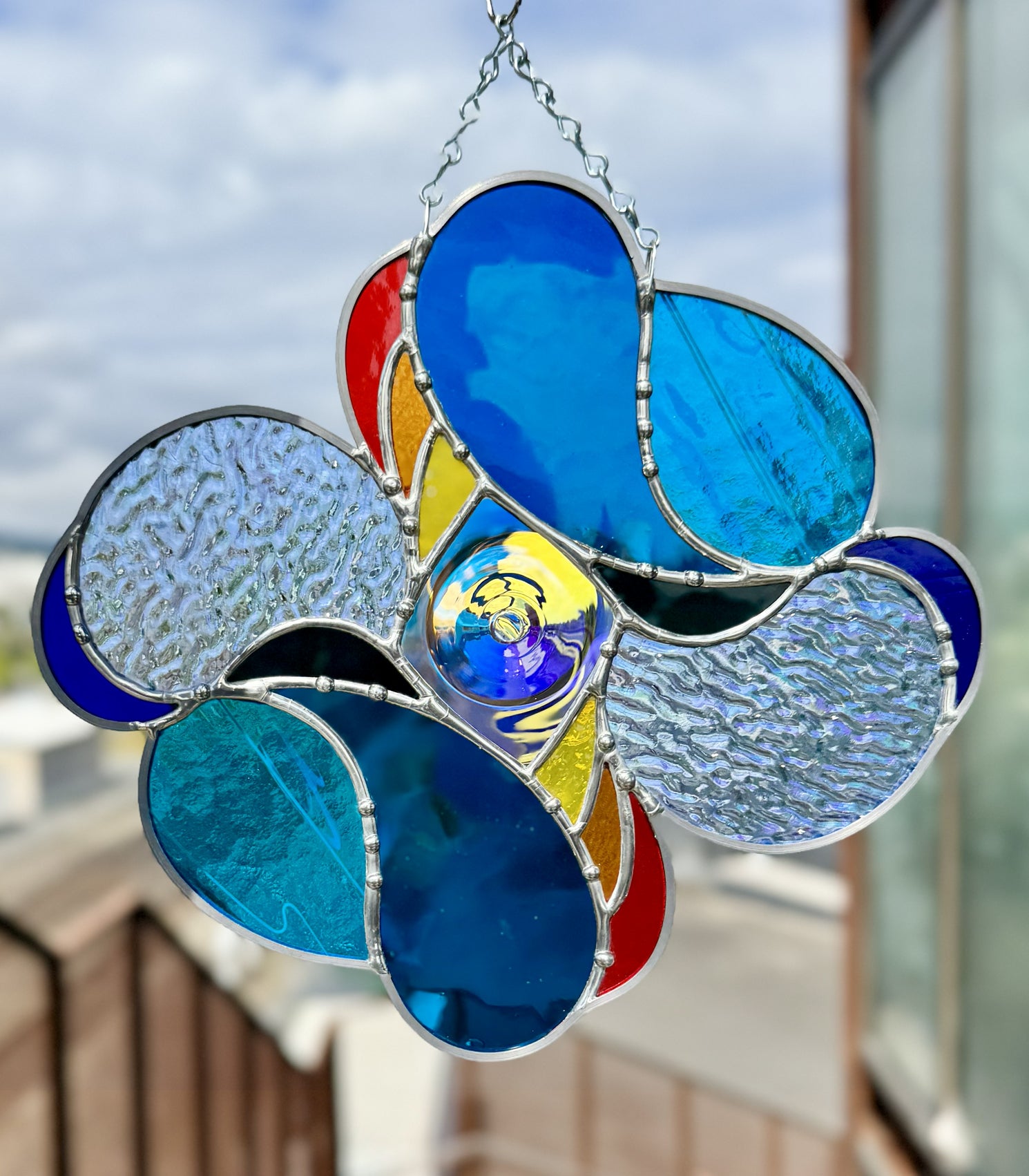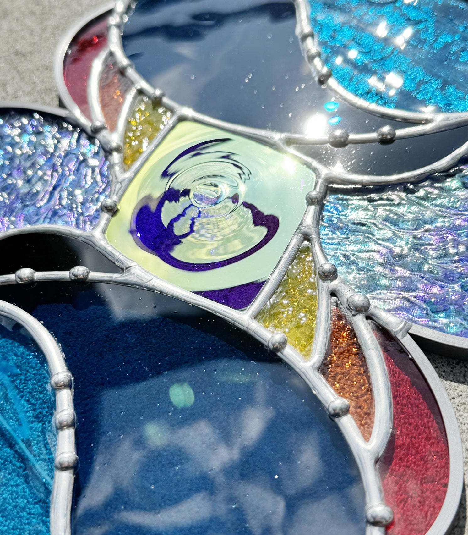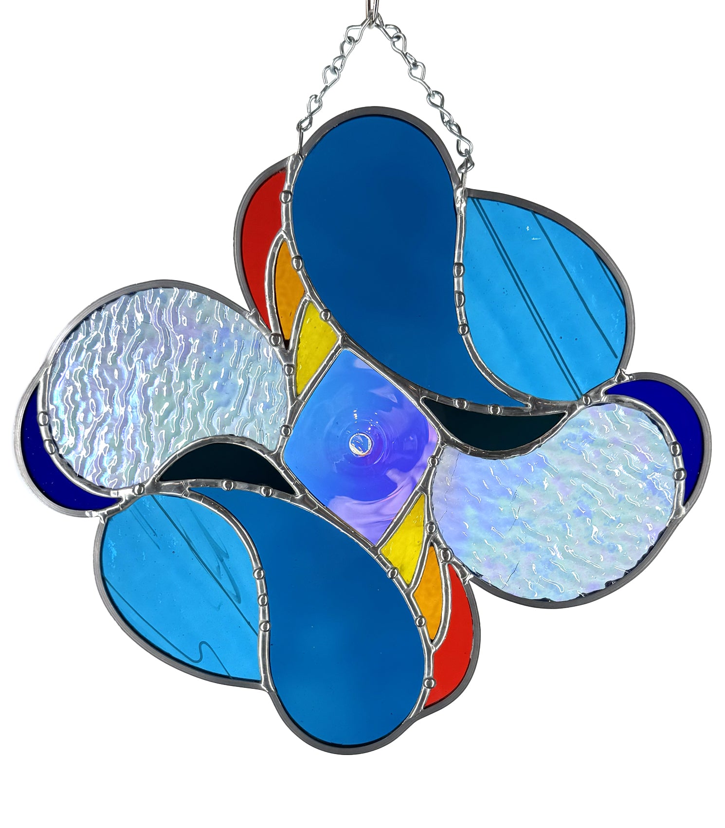 Handmade stained glass suncatcher inspired by sunsets over water. This piece integrates a variety of blue glass, with pieces of vintage mouthblown glass, textured aqua iridescent, and special edition Bullseye confetti all making an appearance. Large dichroic center roundel throws all kinds of continually shifting light. Decorative solder like water droplets finishes off this piece. You receive the exact piece pictured!