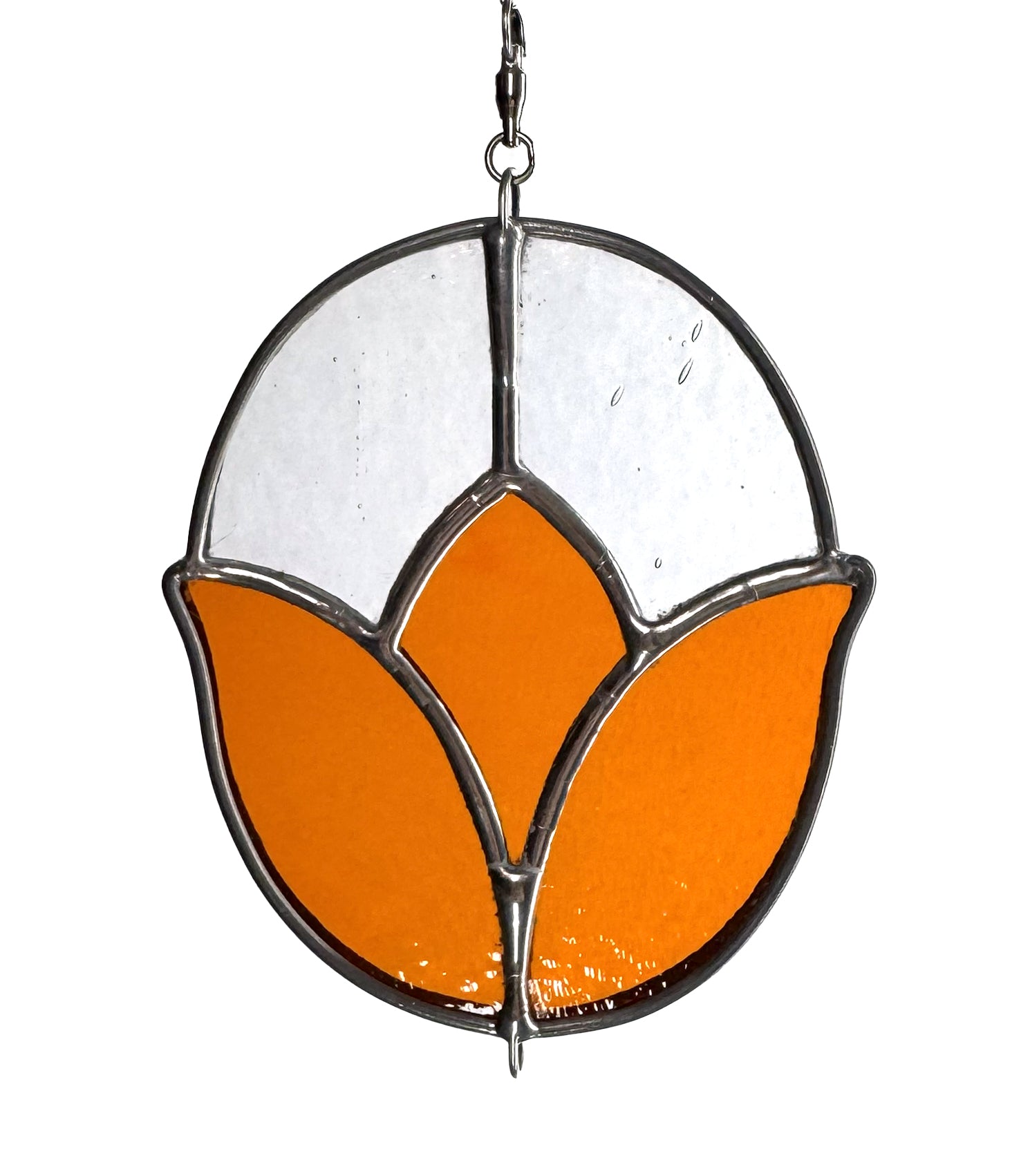 Handmade stained glass suncatcher pendant of a tulip in bright peachy orange, with a clear background with gold iridescence. You receive the exact piece pictured!