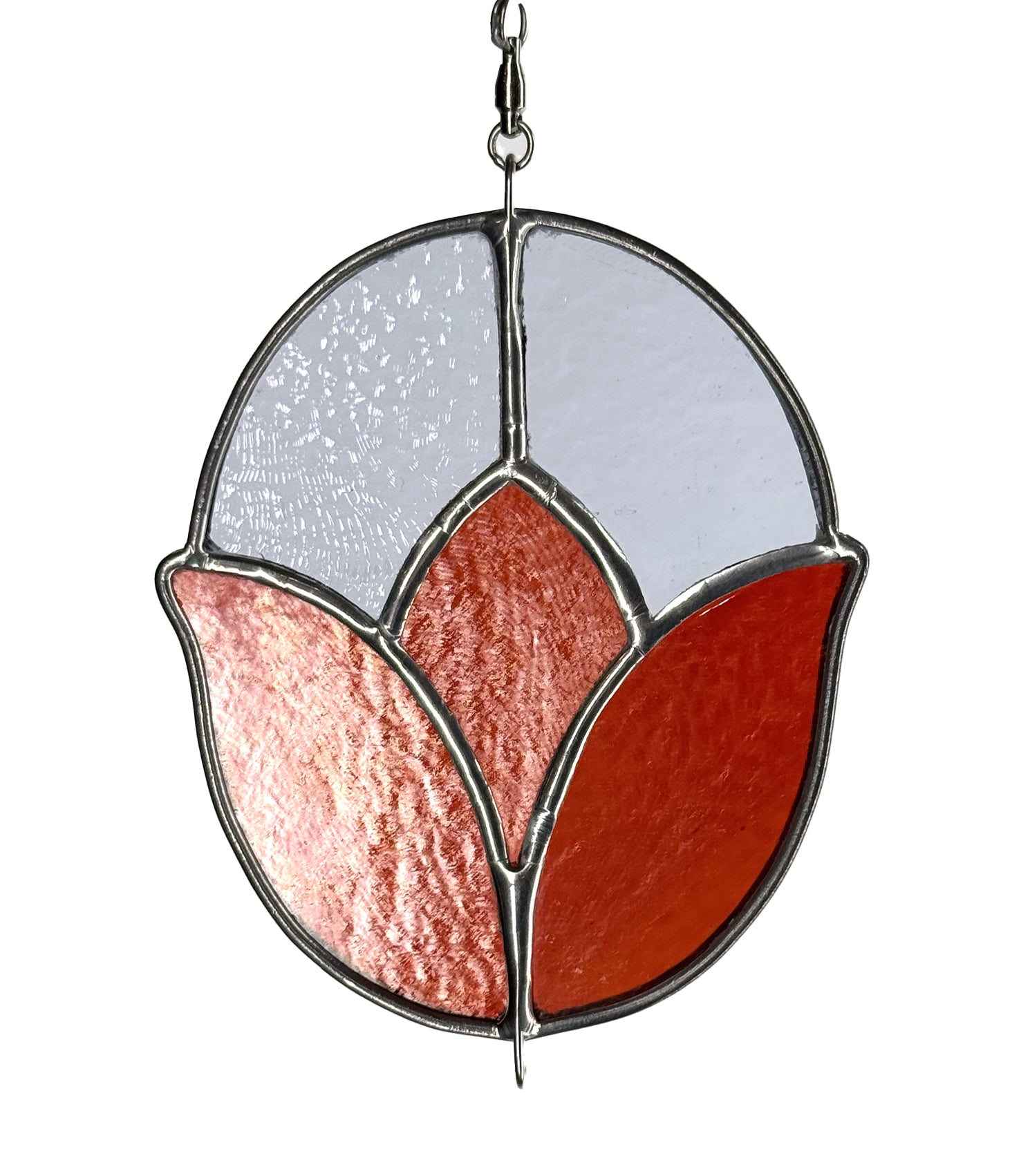 Handmade stained glass suncatcher pendant of a tulip in bright red with silver iridescence, with a subtle purple-tinted clear background. You receive the exact piece pictured!